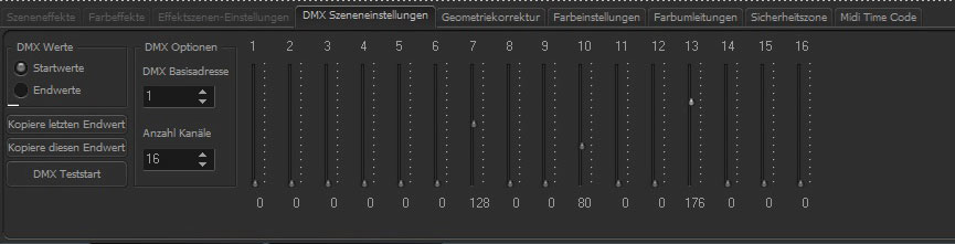 In order to adjust the values one by one during the play of a scene, please set the desired initial and exit values and drag the scene to the desired runtime. The values will be morphed throughout runtime. Here you can i.e. move a DMX dimmer or a Moving Head (RoboLas DMX).