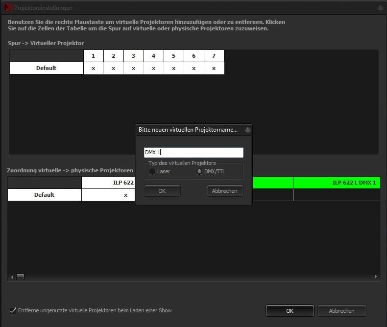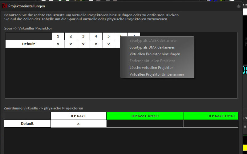 Equally to laser tracks, a virtual projector for routing the DMX track needs to be created. This is done as usual from the context menu with right mouse key. Name the projector accordingly. In this case too the projector should be declared as DMX.